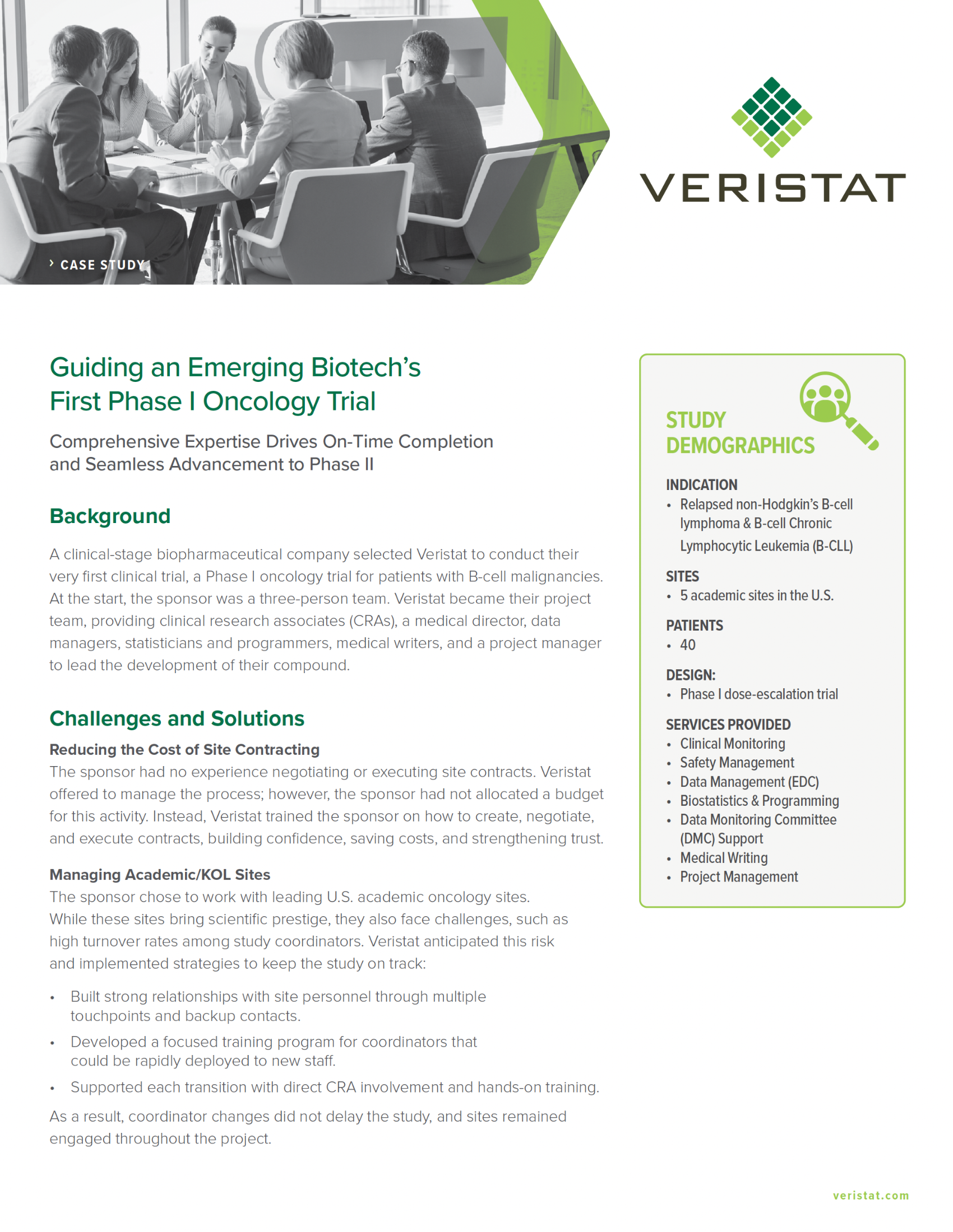 A clinical stage biotech firm engaged Veristat to run their very first ever clinical trial, a phase I US only oncology trial. When the project started, the client was a three-person team. Veristat was and still is the entire project team and we have and continue to work with this client to guide them and train them through the clinical trial process.
