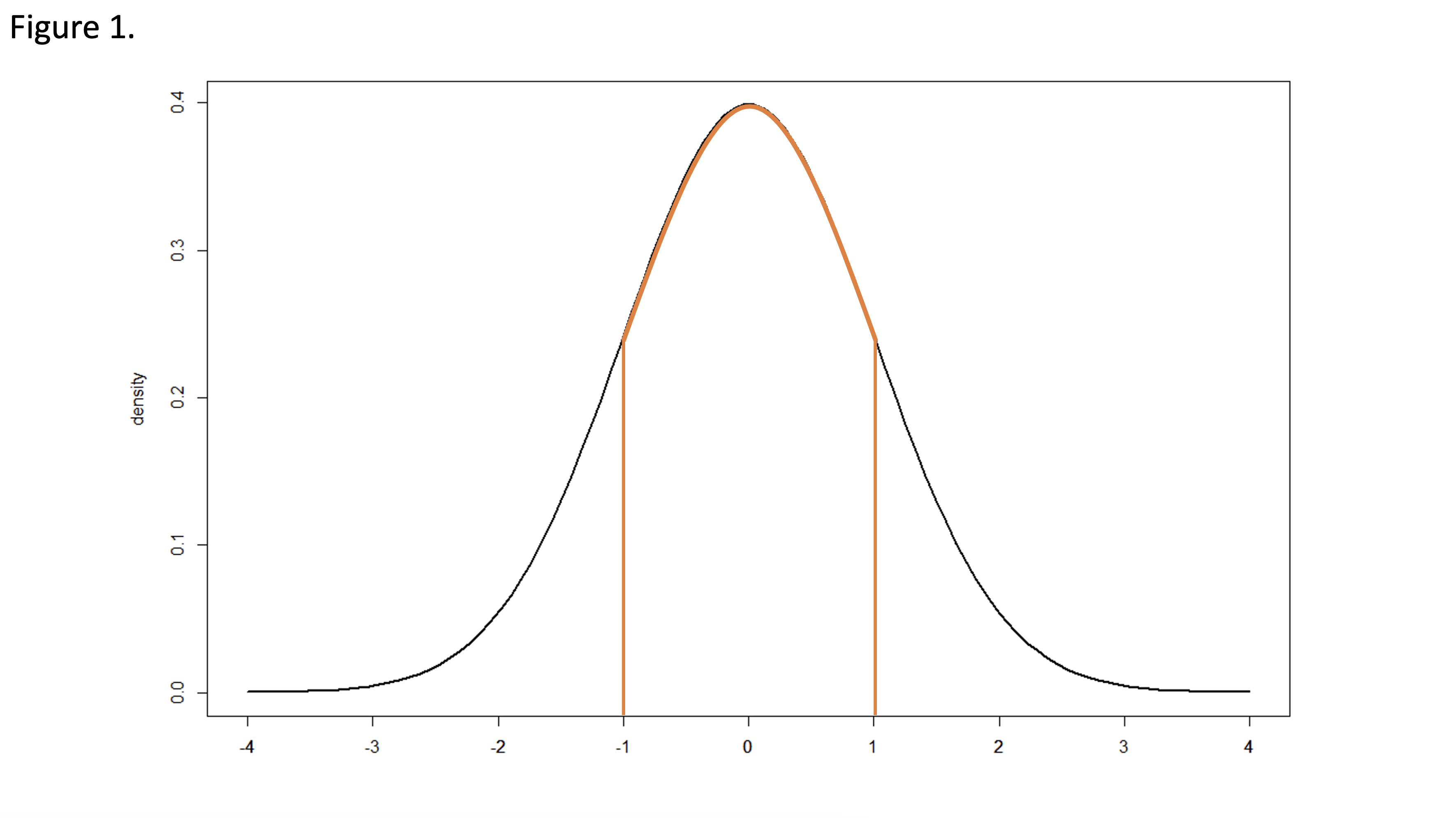 Figure 1 presents the standard normal distribution with a mean of zero and a standard deviation of 1. The probability density for a continuous variable is the probability per unit length. The probability density at a single point will equal 0. The cumulative probability density over a range of values will be greater than 0 and computed as the integral of the probability density function over the designated interval, equaling the area under the curve.