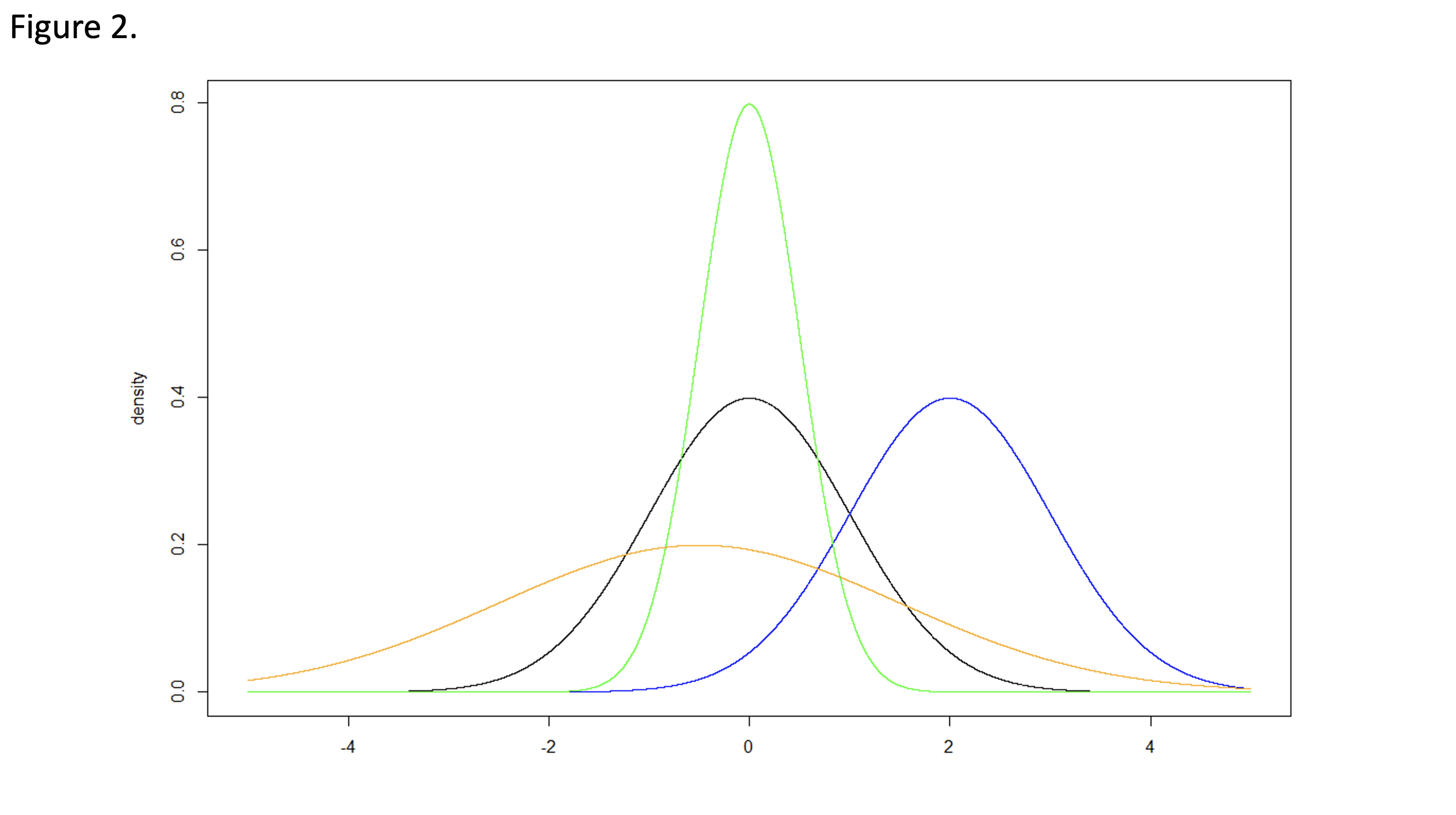 The standard normal distribution is convenient because the mean equals 0, the standard deviation equals 1, and many calculations therefore become straightforward. The same concepts can be extended to location shifts and scaling of the normal distribution. Figure 2 illustrates four normal distributions with varying location (i.e., mean values) and scale (i.e., standard deviations)