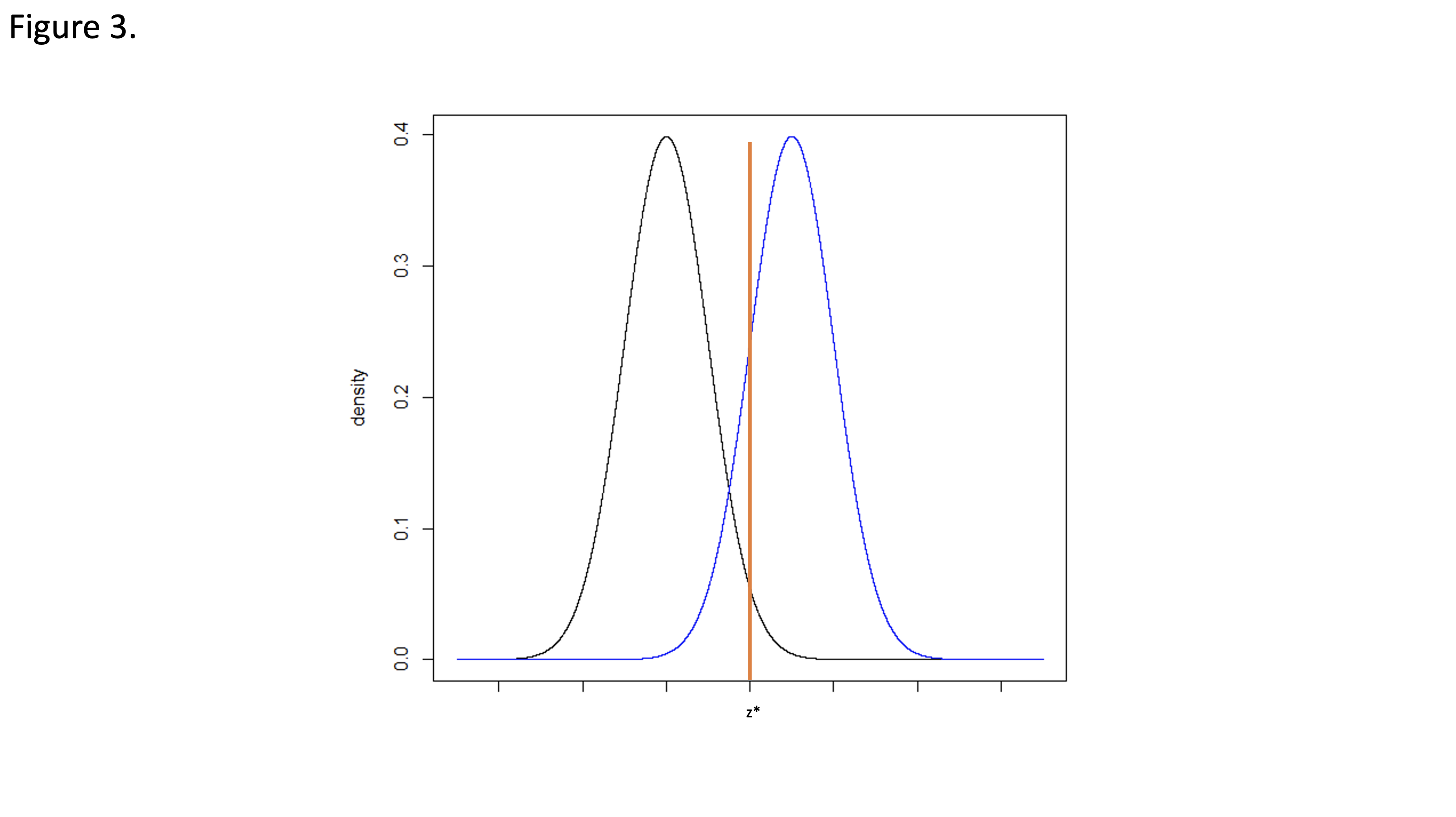 Consider a one-sided null hypothesis: H0: µ0 ≥ µ1 compared to the alternative hypothesis: HA: µ0 < µ1. The Type 1 error rate, α, is the probability of falsely rejecting the null hypothesis under the condition that the null hypothesis is true. Using the normal distributions in Figure 3, we can identify the critical value z* for a one-sided hypothesis test, corresponding to the upper 100*α% of the null distribution where the null hypothesis is rejected. When performing a statistical hypothesis test, we would interpret any value falling above z* would be unlikely to come from the null distribution. If the null hypothesis is true, this would be a “false positive.”