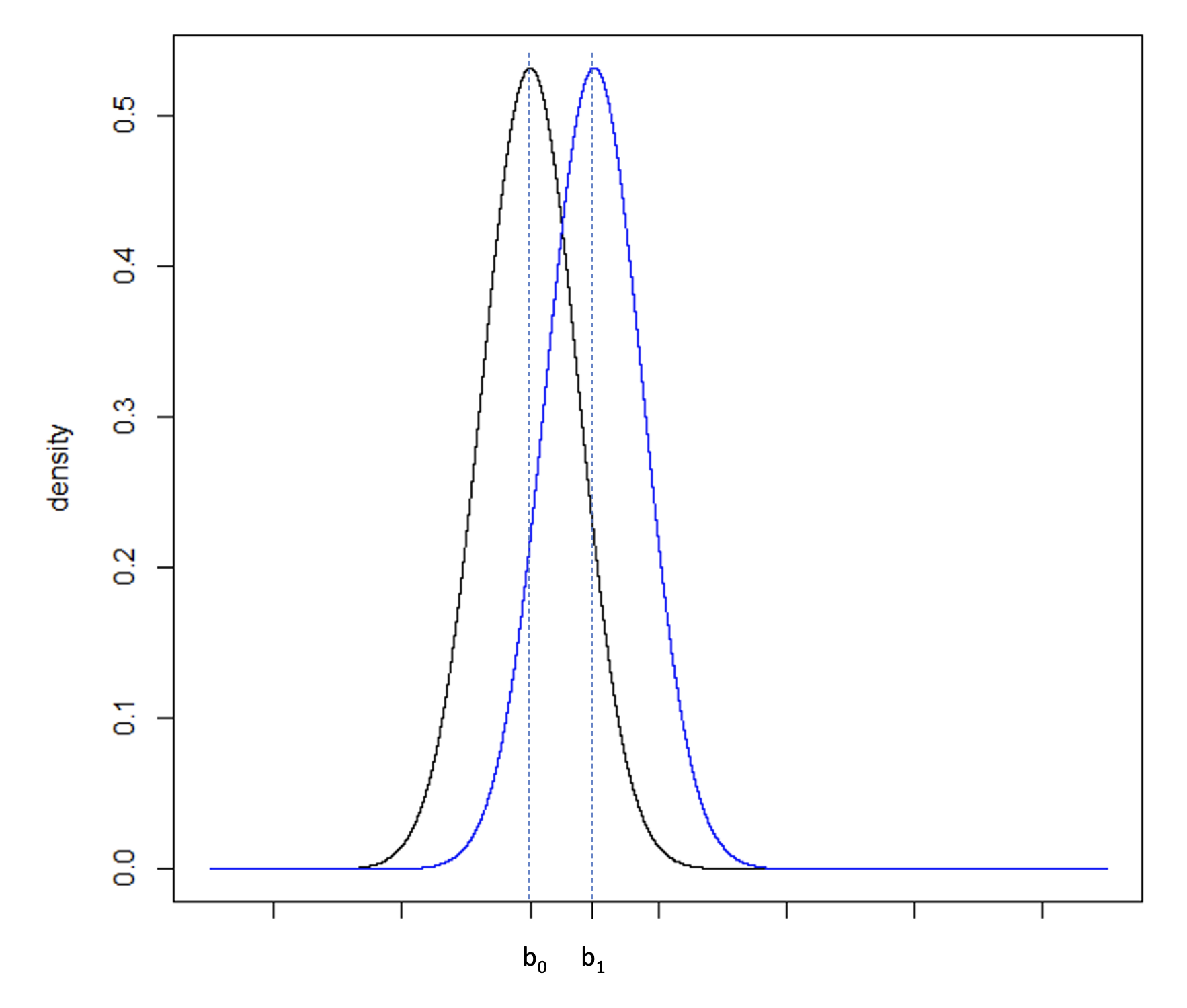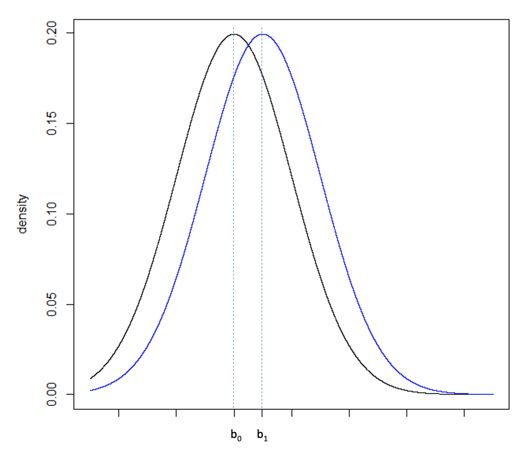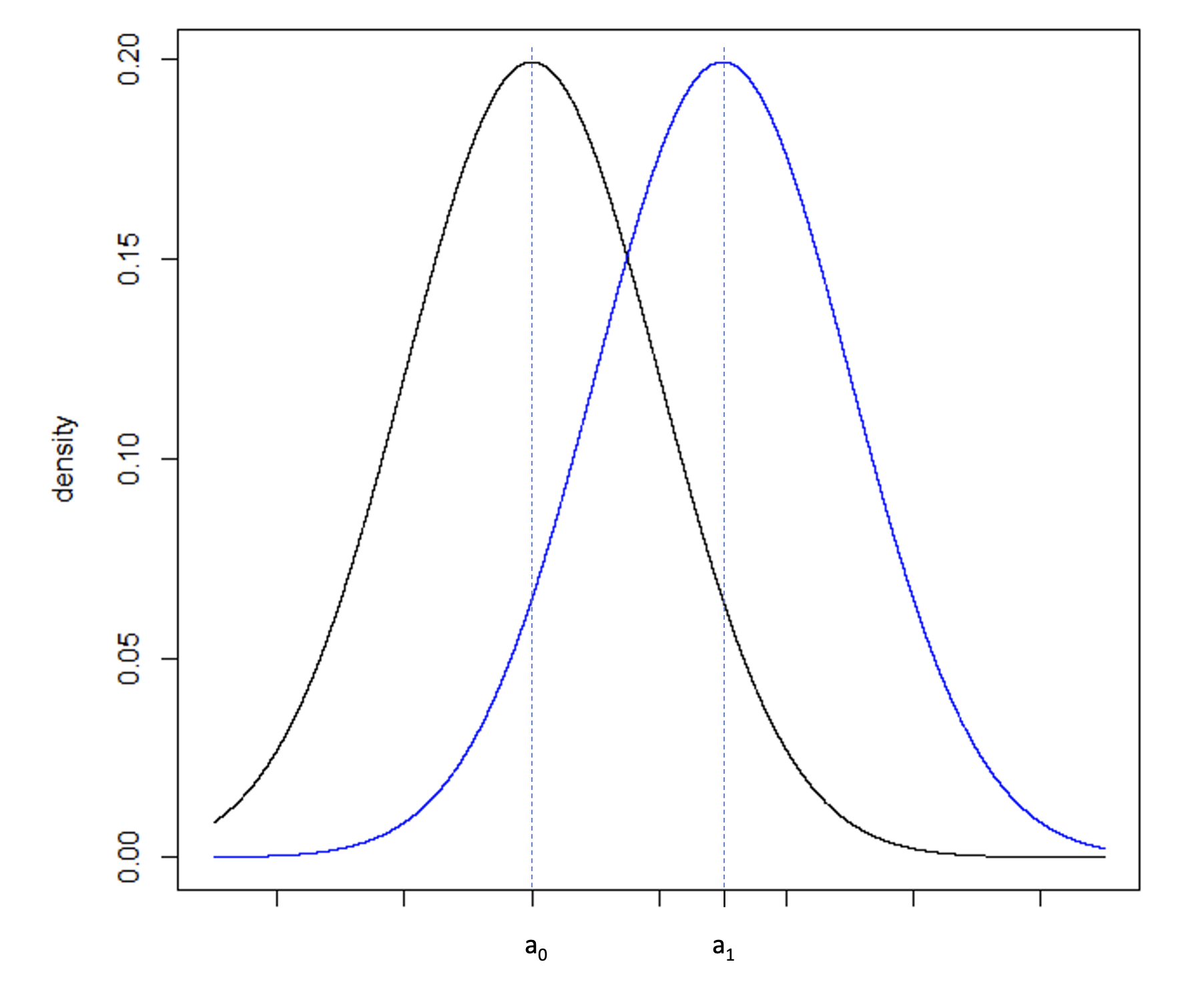 Consider Figure 5a, illustrating two normal distributions with a0 and a1 having a large difference compared to Figure 5b where b0 and b1 fall closer together. The underlying standard deviation expected from each distribution is the same. In Figure 5a, the standard deviation is small in comparison to the difference between a0 and a1. In Figure 5b, the standard deviation is large in comparison to the smaller difference between b0 and b1. To increase the power of a hypothesis test of the null and alternative hypothesis: H0: b0 ≥ b1 vs. HA: b0 < b1, the precision of the sample estimate must be increased, which can be achieved by increasing the sample size, and therefore reducing the standard error of the sample, Figure 5c.