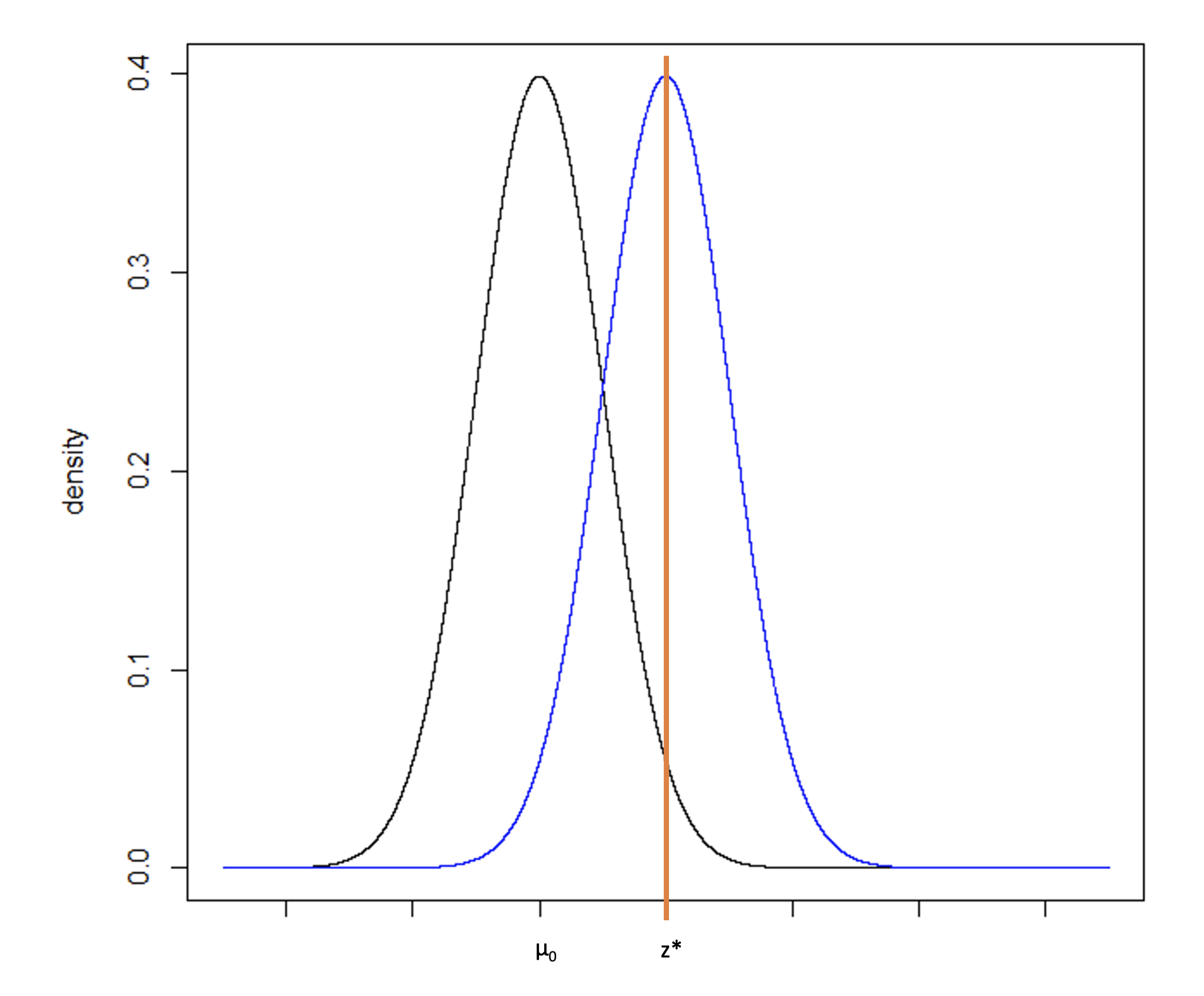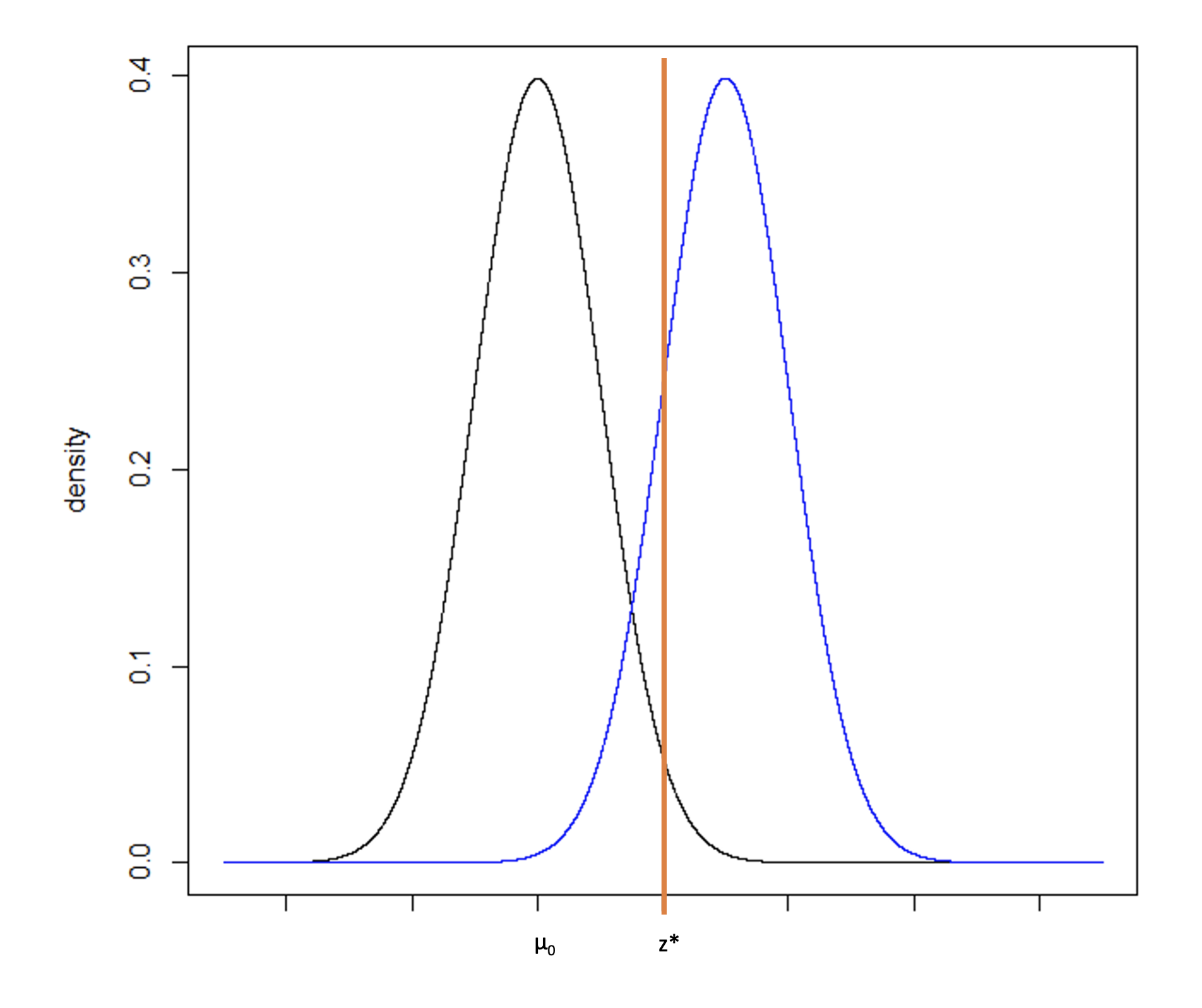 While the translation from the normal distribution to a difference in means (for example) is a straightforward calculation, sometimes test statistics are difficult to back-transform and the calculation is not obvious. As an alternative approach, we can consider Figure 7 with two normal distributions, one centered on µ0 and one centered on z*. Recall that power is equal to the probability of rejecting the null hypothesis if the alternative hypothesis is true. It is computed as the cumulative probability density falling above the critical value, z*.